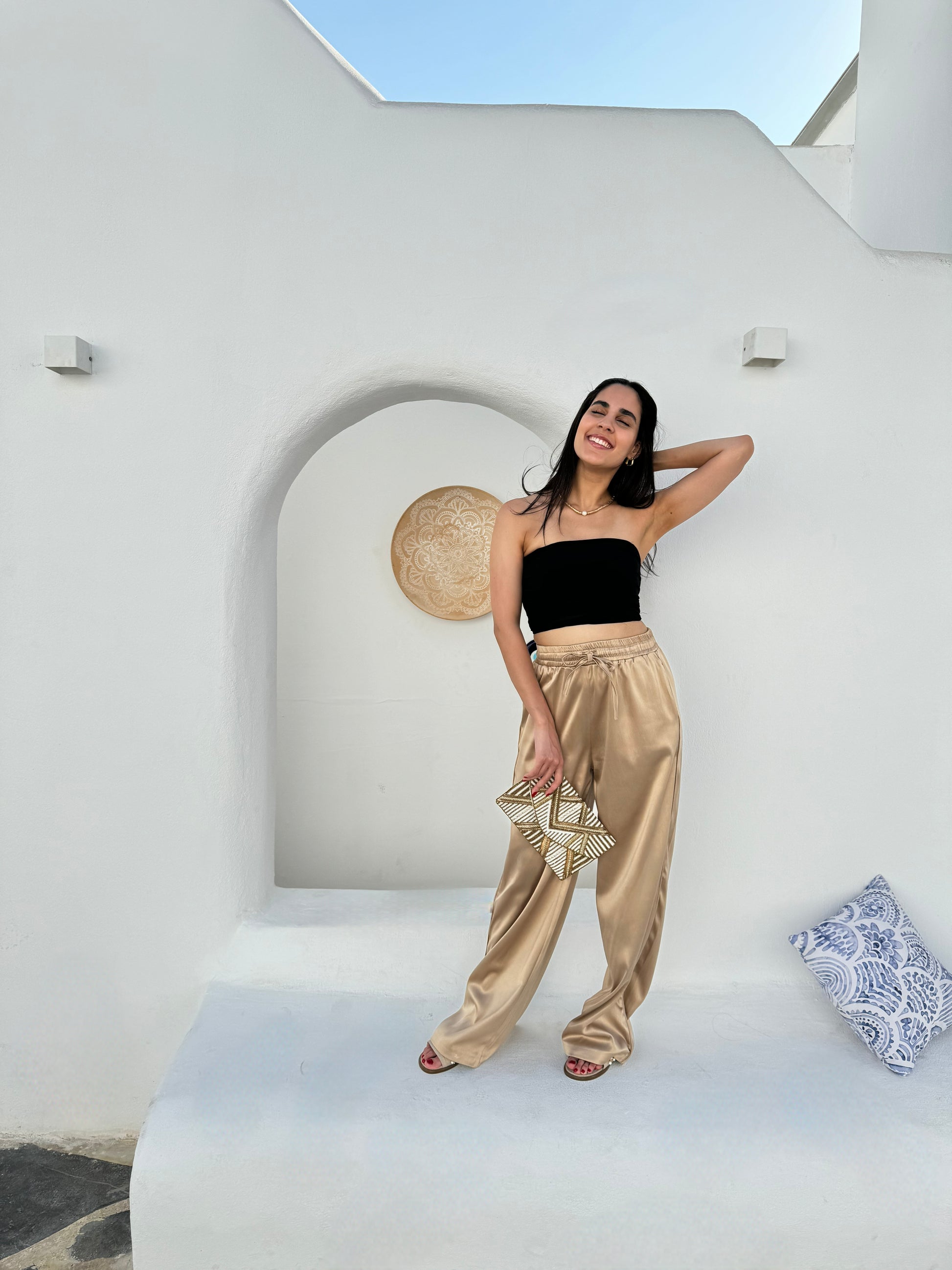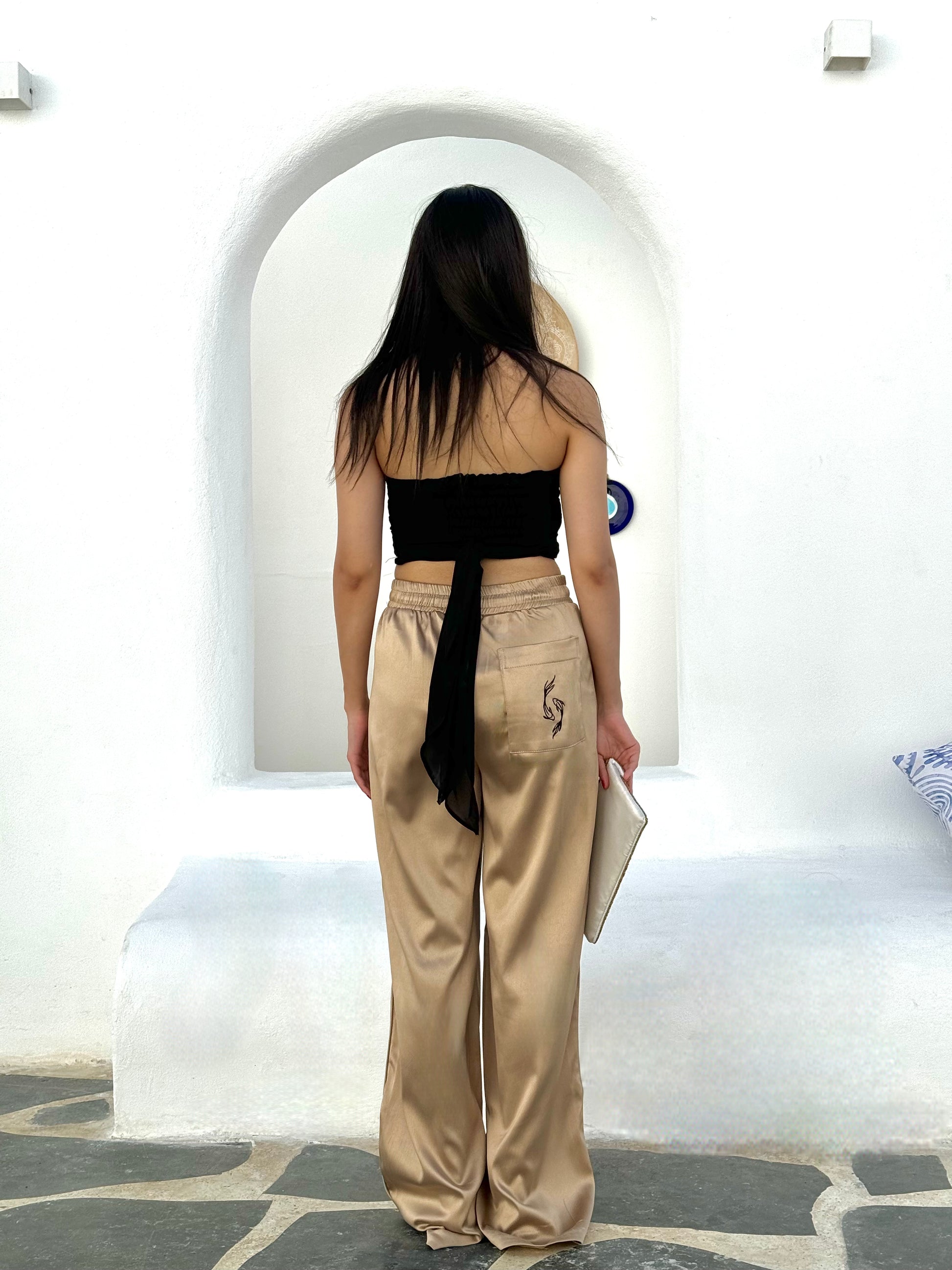 Illuminate your look with the Aurora Satin Pants in gold. These luxe satin pants are all about opulence and style, perfect for adding a touch of glamour to any occasion.