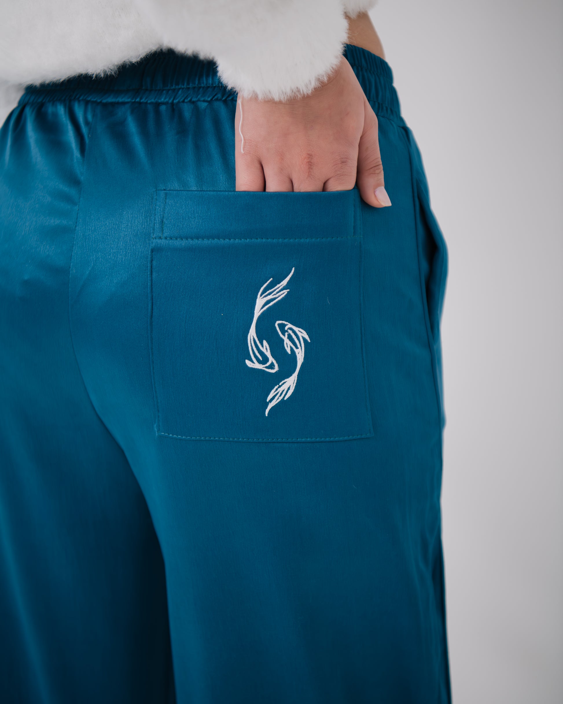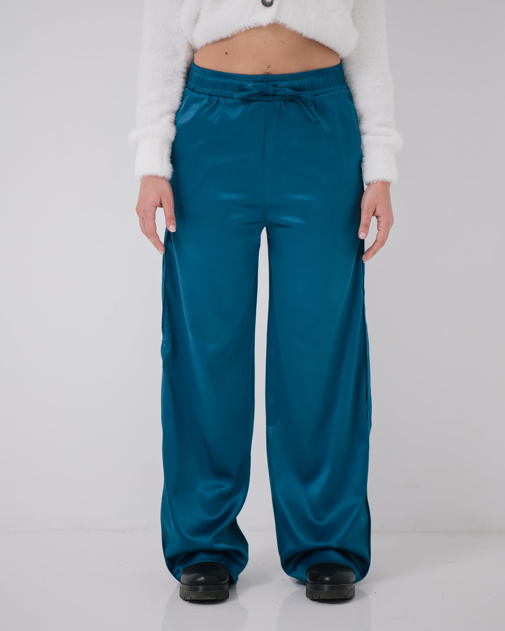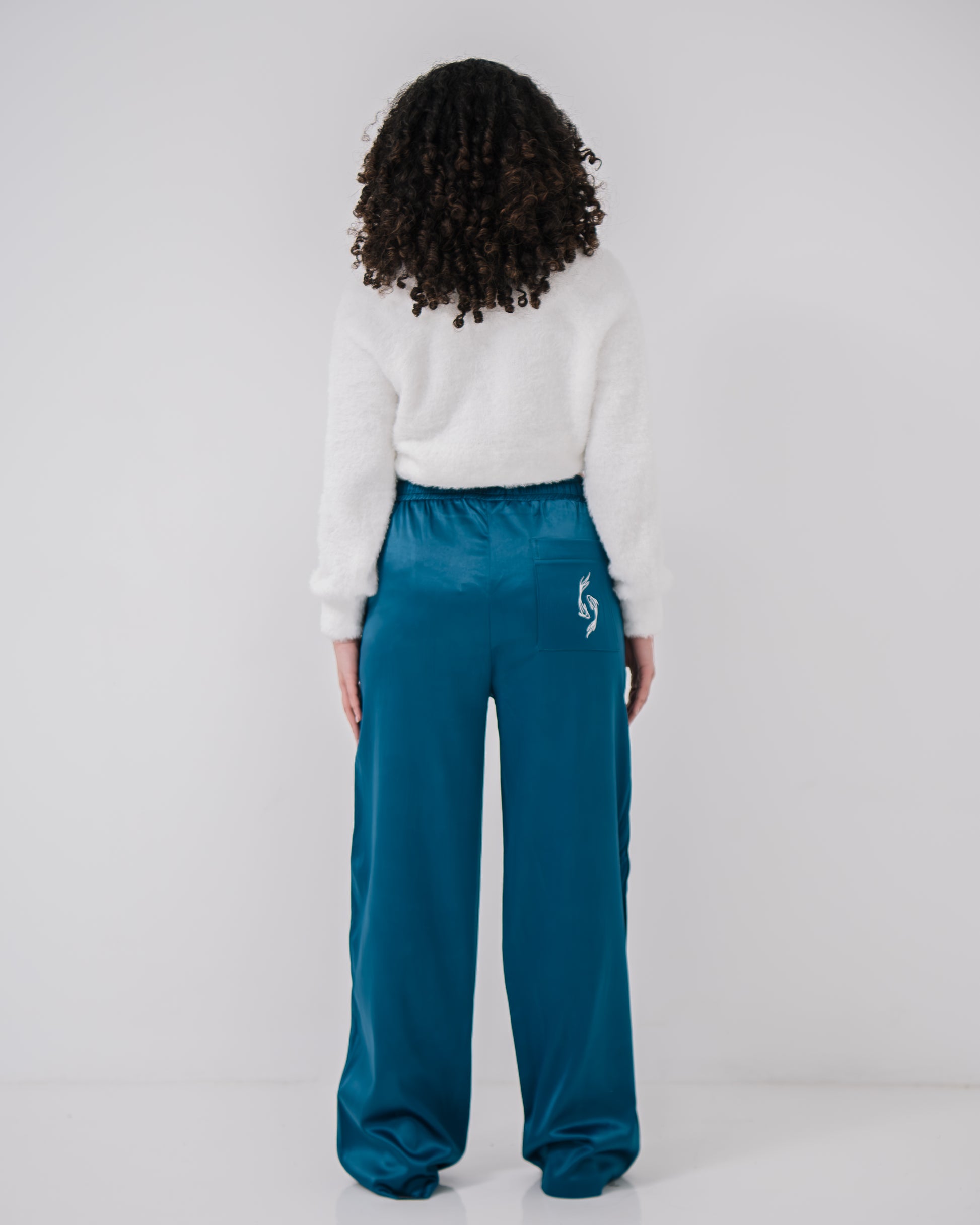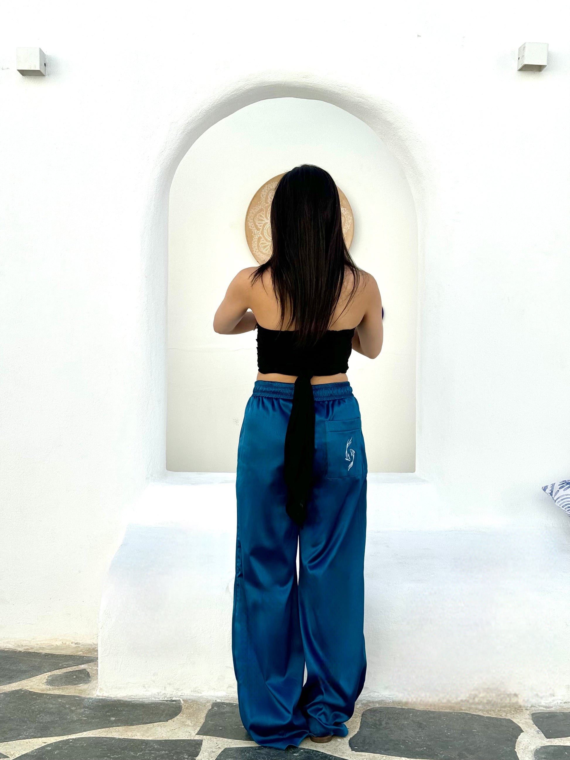 Make waves in the Ocean Satin Pants in royal turquoise. These bold satin pants bring a splash of vibrant elegance, perfect for standing out at any event.